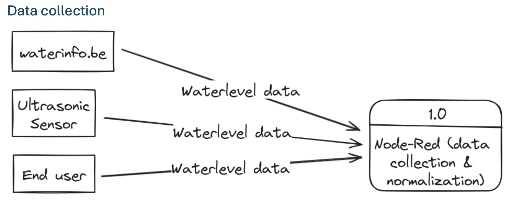 Data is collected from three main sources: waterinfo.be (via API calls), ultrasonic sensors (via MQTT connection), and manual input from end users through the web application. Node-Red was used as the backend to set up data collection functionalities, combining these diverse data sources.
