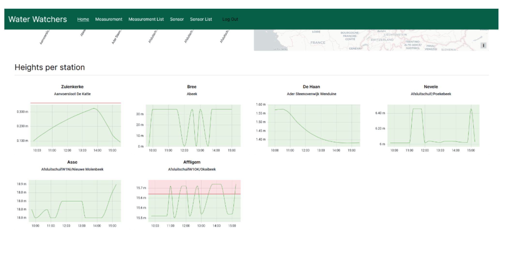 A NextJS web application provides users with easy access to existing data and graphs. This dashboard includes a homepage with a bar graph and a map graph, as well as individual graphs for each location. Users can add images of their sensor setups and subscribe to locations to receive push notifications when water levels exceed preset levels. A "Measurements" tab allows users to add warnings for specific sensors, triggering notifications, while a "Sensor" tab allows users to add new sensors by providing details like municipality, name, and location.
