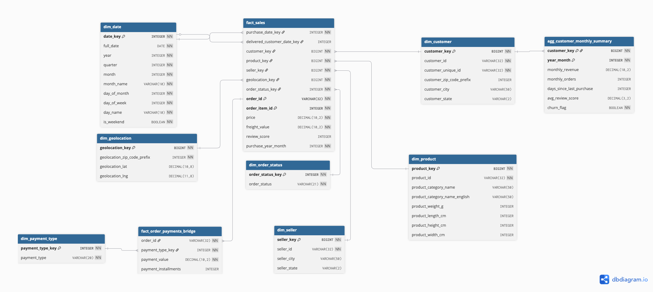The Discovery: When I first sketched the relationships in dbdiagram.io, I thought I was looking at a straightforward star schema. Then I hit the payments table and realized one order could have multiple payment types. Traditional star schemas hate many-to-many relationships.