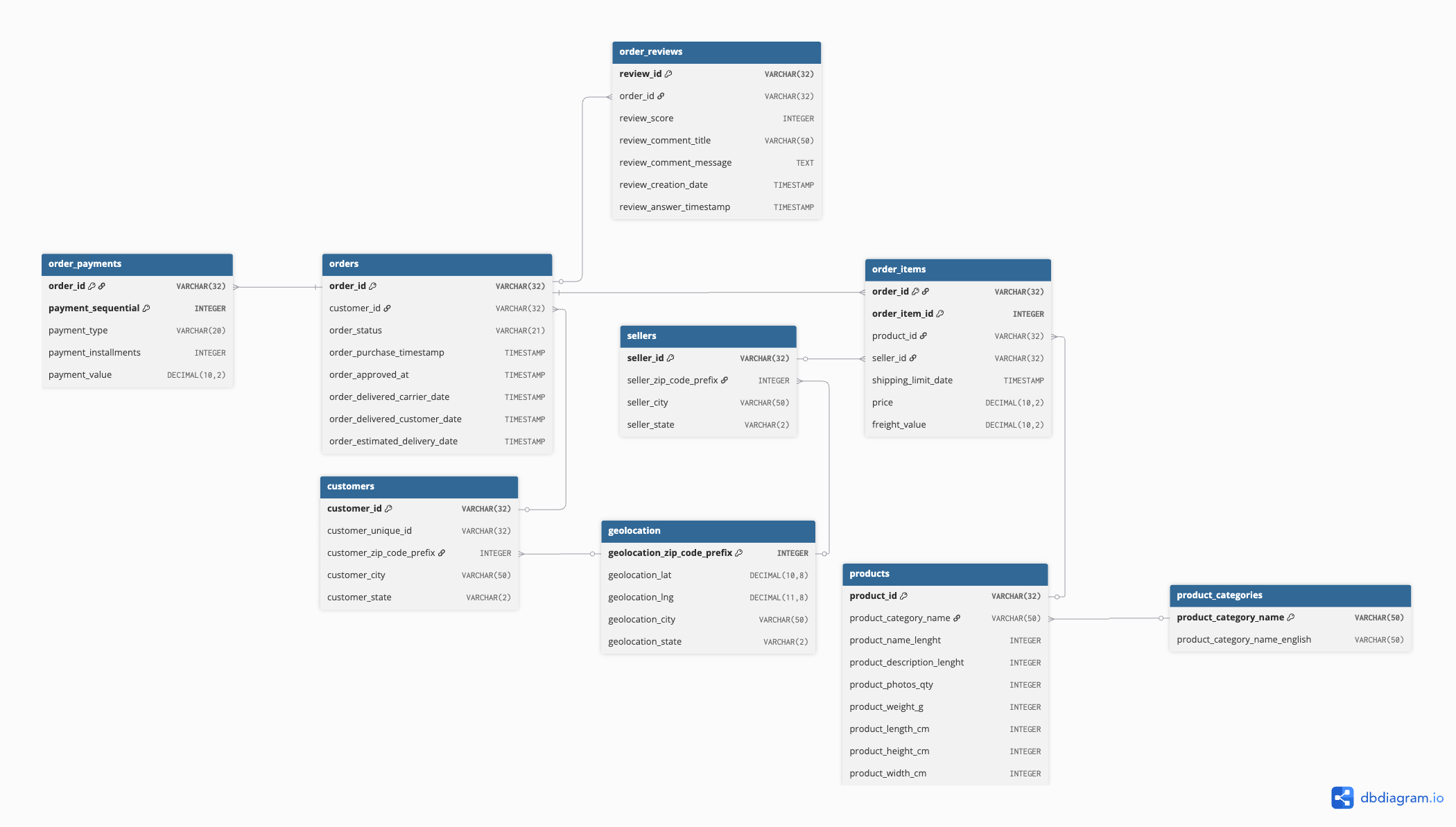 I discovered the Olist dataset nine(9) CSVs with 100,000+ e-commerce orders that didn't quite align with a standard star schema. Before writing a single line of ETL, I spent time in dbdiagram.io, sketching relationships and validating connections across tables. This upfront investment in understanding the data would save me from a painful mistake later